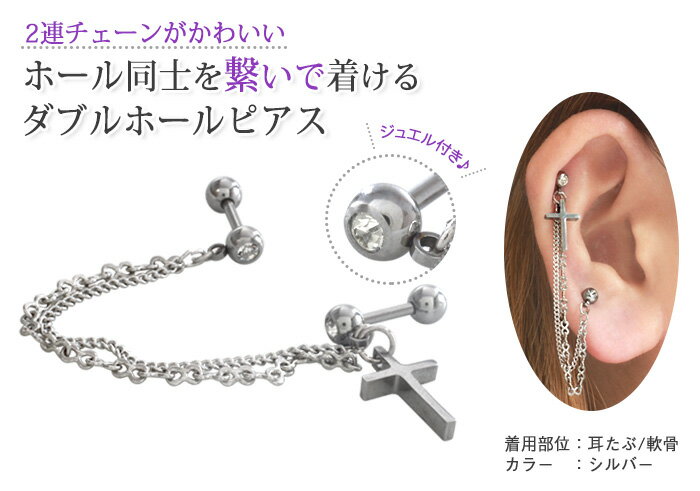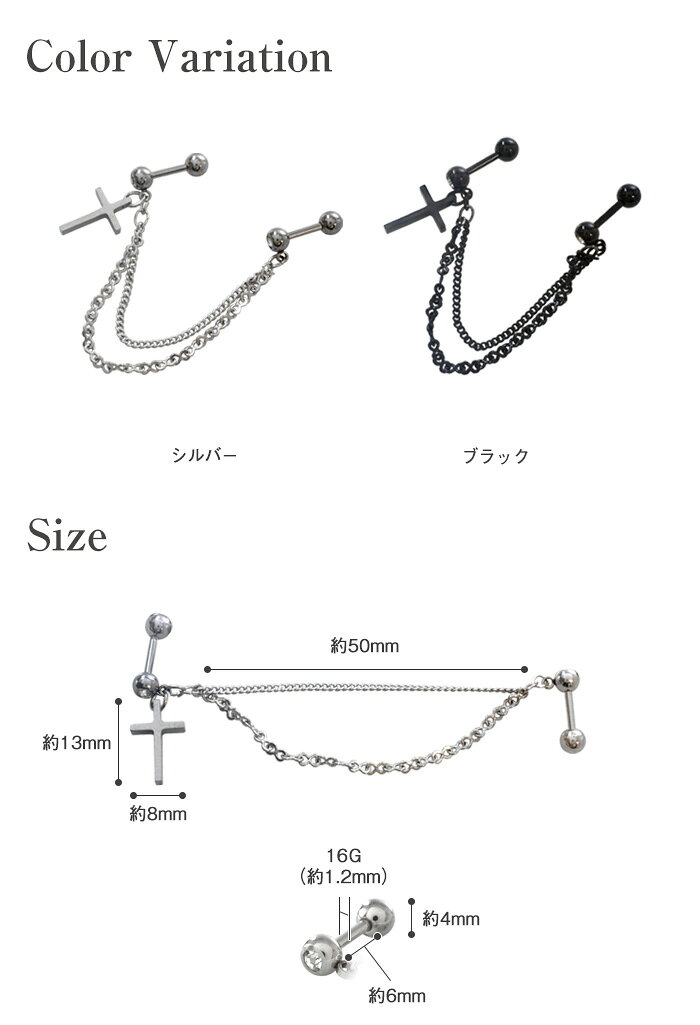 ◆オススメポイント◆ 2連チェーンがかわいい ホール同士を繋いで着ける ダブルホールピアス ワンポイントのジュエルと 輝く十字架デザインで大人上品に・・・ ◆SPEC◆ オススメ部位 耳たぶ・イヤーロブ・軟骨・ヘリックス・etc サイズ 16G(軸の太さ約1.2mm) 素材 シルバー:サージカルステンレス316L(医療用) ブラック:サージカルステンレス316L(医療用)にカラーメッキコーティング 軸の長さ(内径) 約6mm モチーフサイズ(縦×横) 約13mm×約8mm チェーンの長さ 約50mm キャッチサイズ 約4mm カラー シルバー ブラック ご注意 【こちらのアイテムは1つでの販売となります】 ※両耳に着用される際は2つご購入が必要となります ※入荷時期により内径サイズが若干変更になる場合がございます ※商品撮影時には、実物の色・形・質感を出来る限り、再現できるよう細心の注意を払っておりますが ご使用の閲覧環境などにより、明るさ・色彩等が現物とは異なって見える場合がございます。